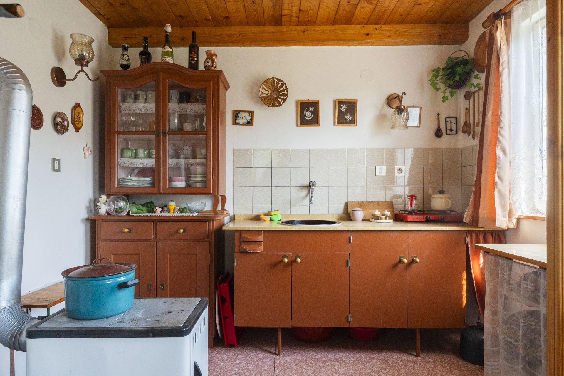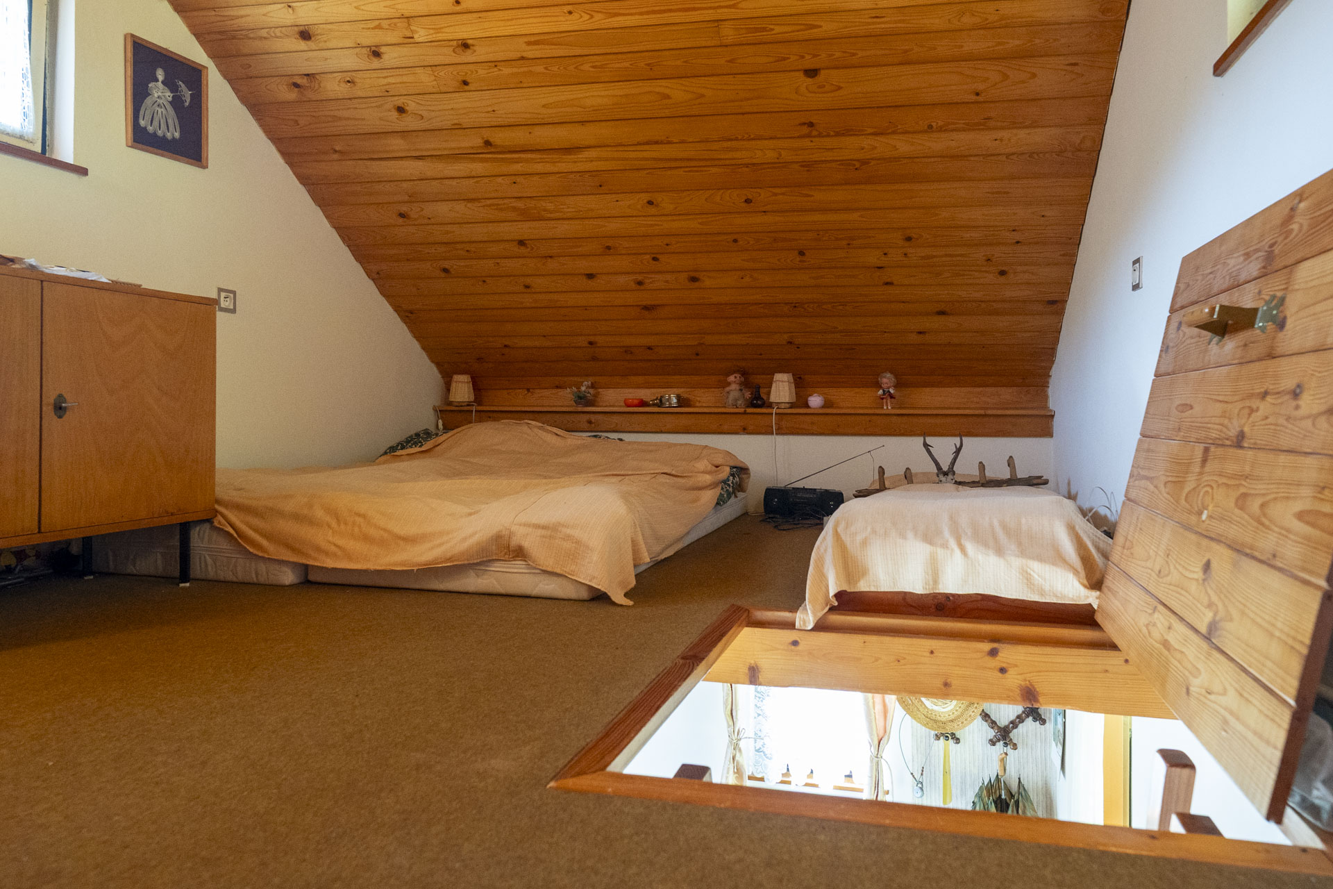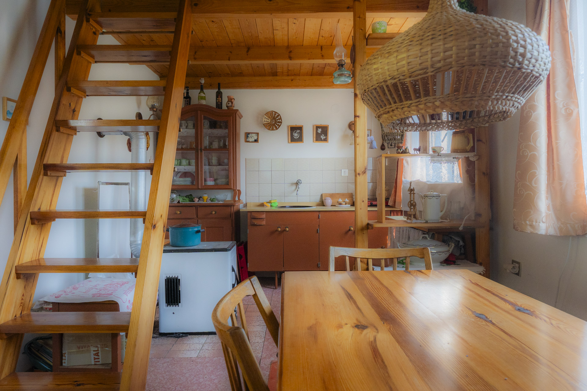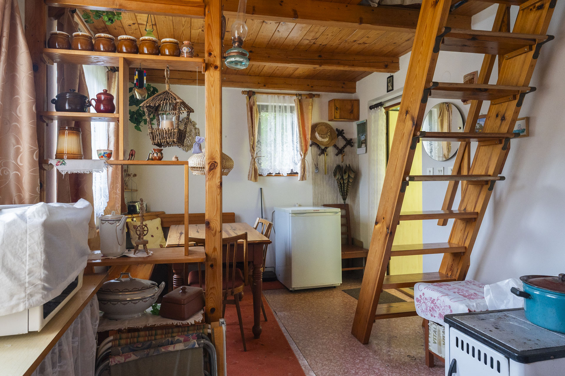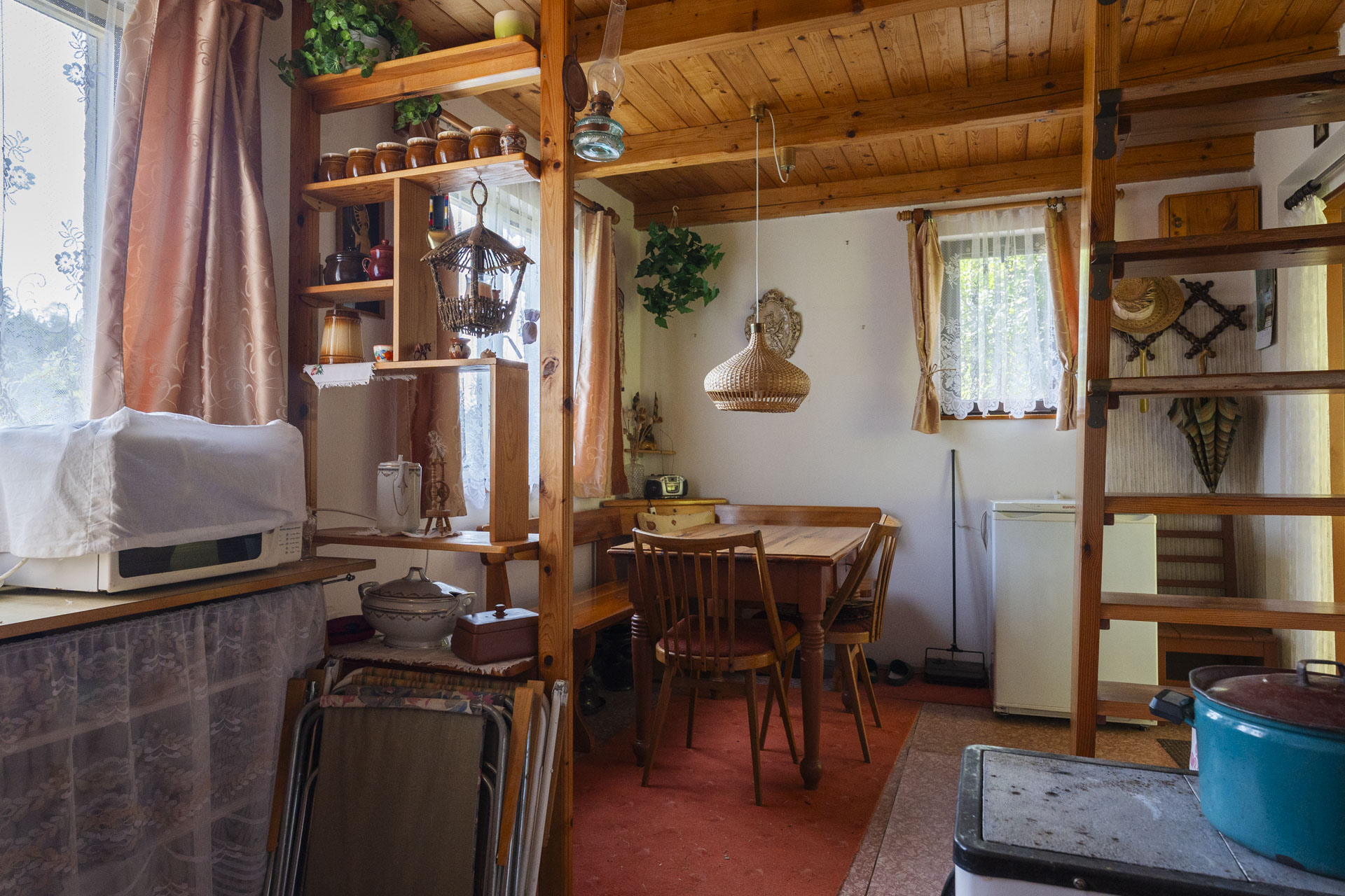 Dispozice nabízí obytnou místnost s kuchyňskou linkou, kamny na dřevo, a příjemným posezením. V podkroví je útulná ložnice pro tři až čtyři osoby. Ve spodní části chaty je toaleta, umyvadlo a samostatný studený sklípek na uskladnění potravin. Chata se prodává včetně vybavení – lednička, mikrovlnka, nádobí, příbory i základní kuchyňské potřeby zůstávají k dispozici.